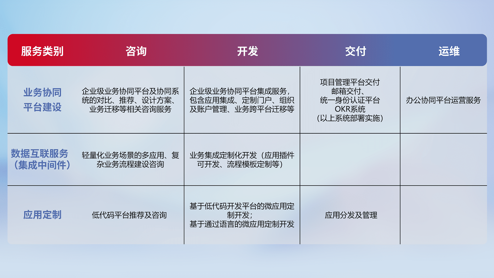 针对钉钉、、企微、、IDaas等平台级产品提供产品的规划、、方案、、、交付、、、定制化开发等服务,,,实现如统一协同办公、、、、智能客户服务、、、混合会议管理、、、智能数据查询、、、等业务场景,,,实现数字化转型。。。。